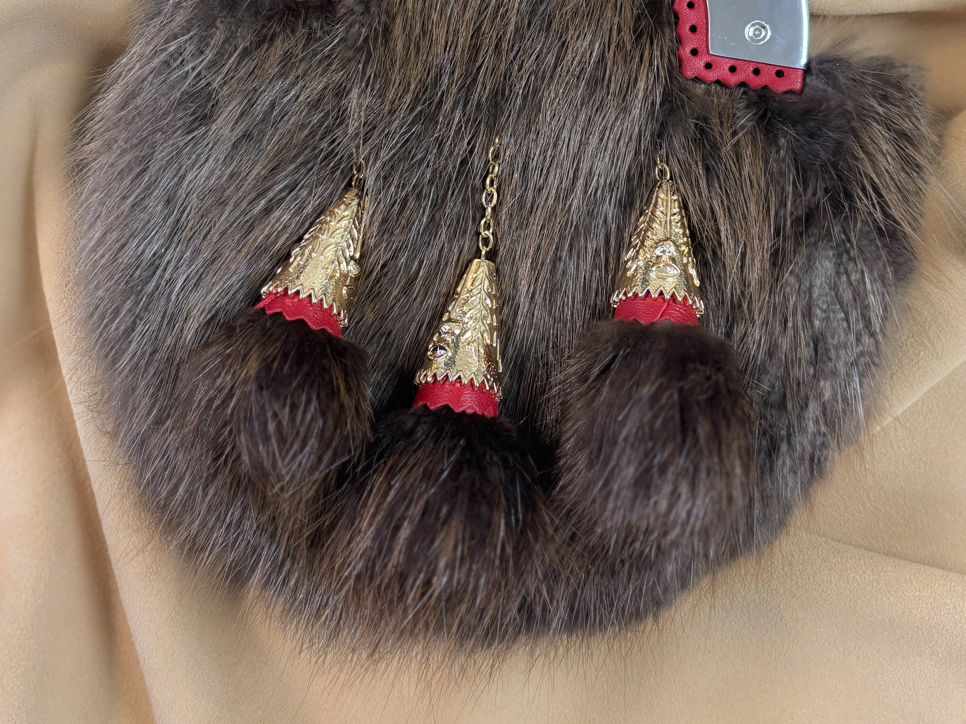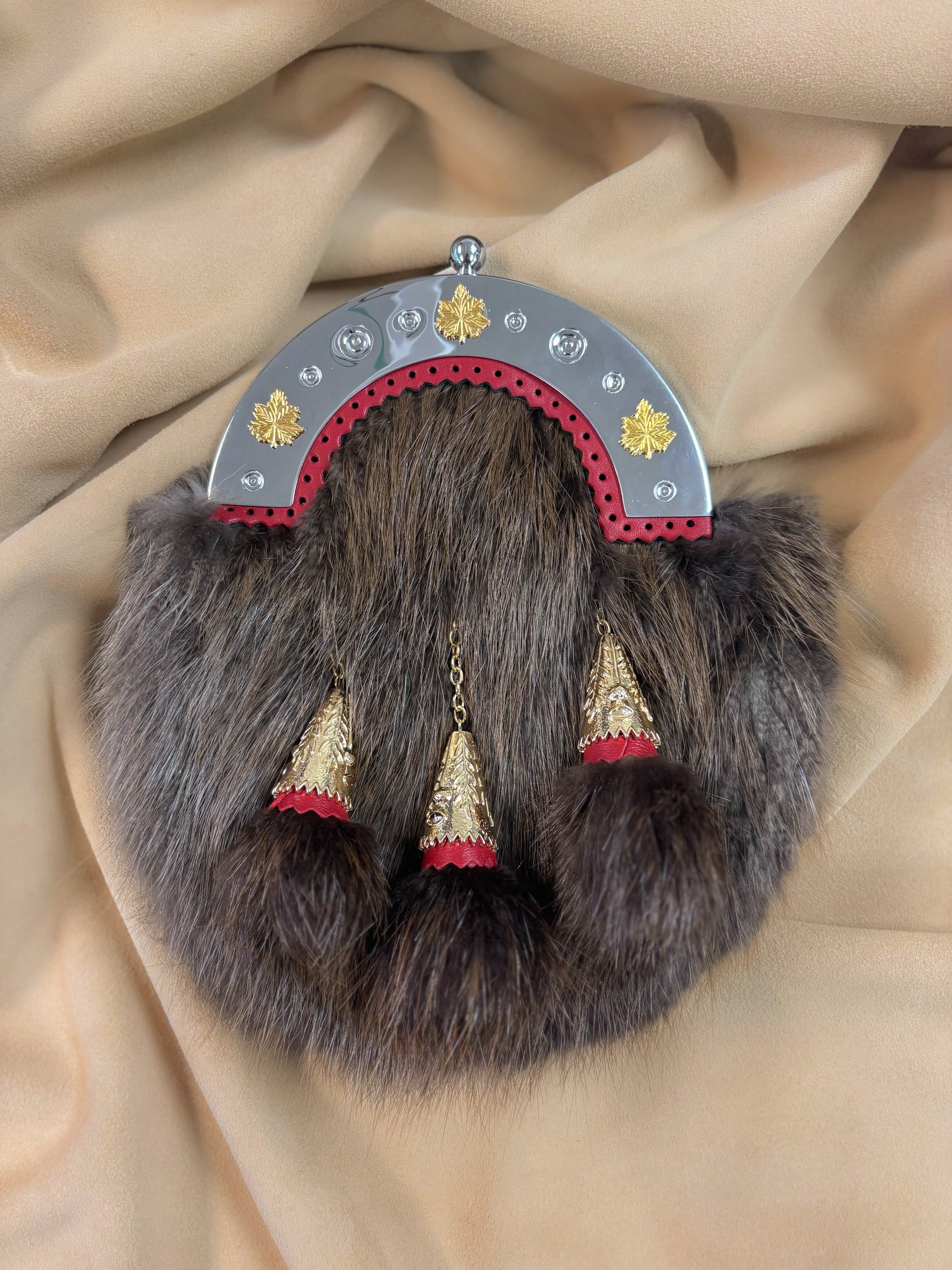 This impressive sporran uses beaver fur for the front body and tassels. The cantle has an elegant smooth chrome finish with 3 mounted gilt maple leafs. The tassel chains are gilt as is the serrated thistle cones. The cantle and tassel cones are lined with red leather.