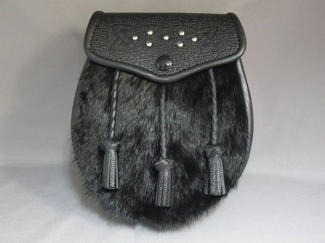 This sporran features a black pig grained leather flap with dual Celtic eternity embossing and studs. The front features black rabbit fur and all leather tassels.