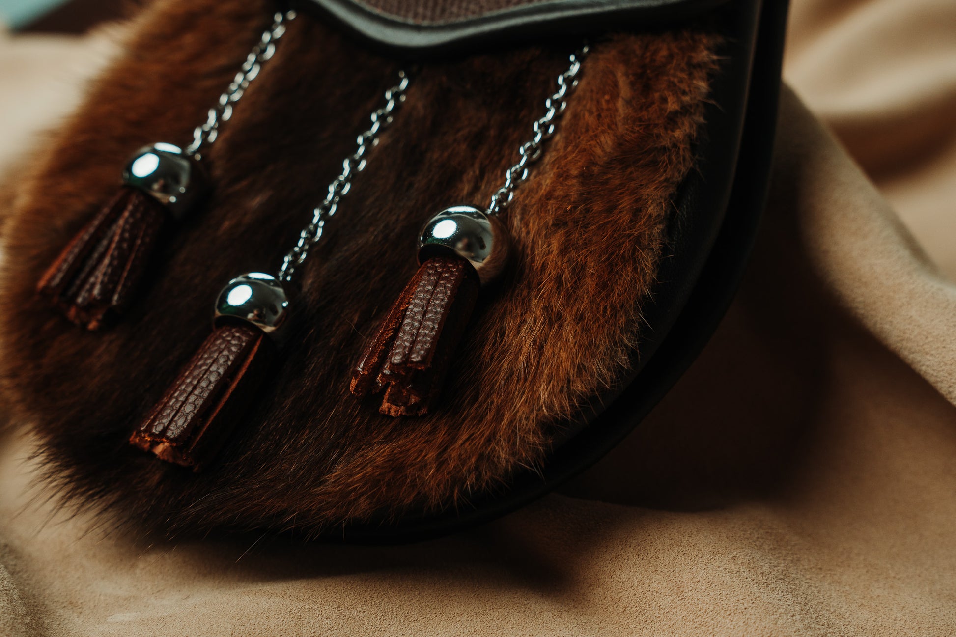 This sporran features a brown pebbled leather flap with decorative binding. The body utilizes luxurious brown muskrat fur and 3 leather tassels with chrome chain and ball bells.