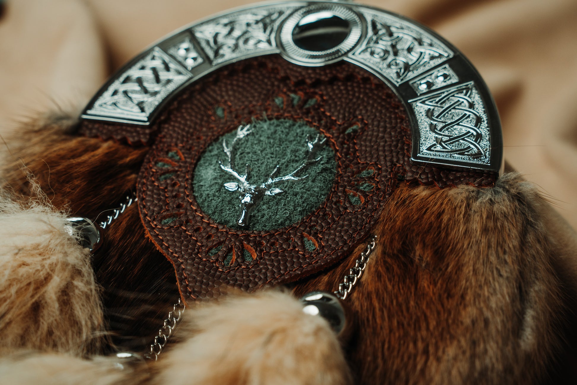 The "Vale" utilizes colours and textures found throughout the natural world. From the brown muskrat fur to the forest green suede and pebbled brown leather. The chrome cantle features scrolled dragons and traditional Celtic symbols. The badger fur tassels hang on chrome chain and ball bells. Finally, in the center of the targe a chrome stag is mounted.