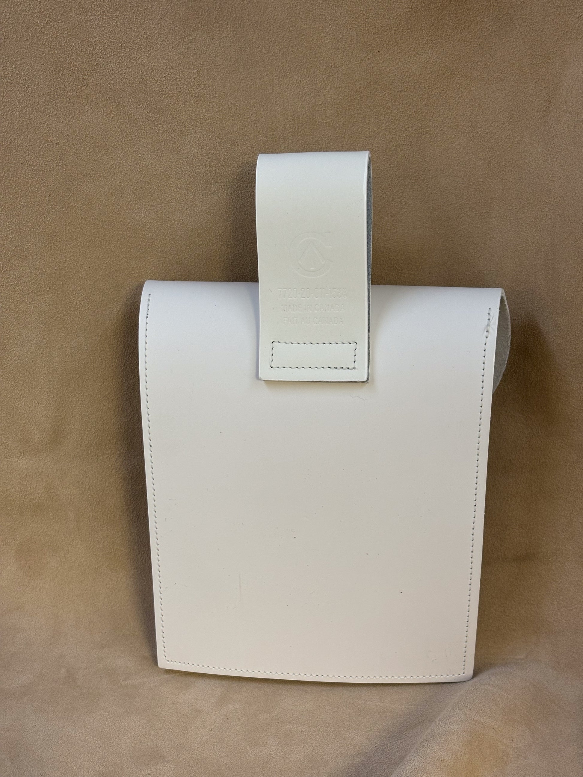 This pouch is used to store and carry sheet music cards and made from full grain leather. Available in black, white and patent black leather. The flap is secured by a stud to ensure no accidental opening. The pouch features a single leather loop for attaching to either a 2 1/4"or 2 1/2" wide waist belt.