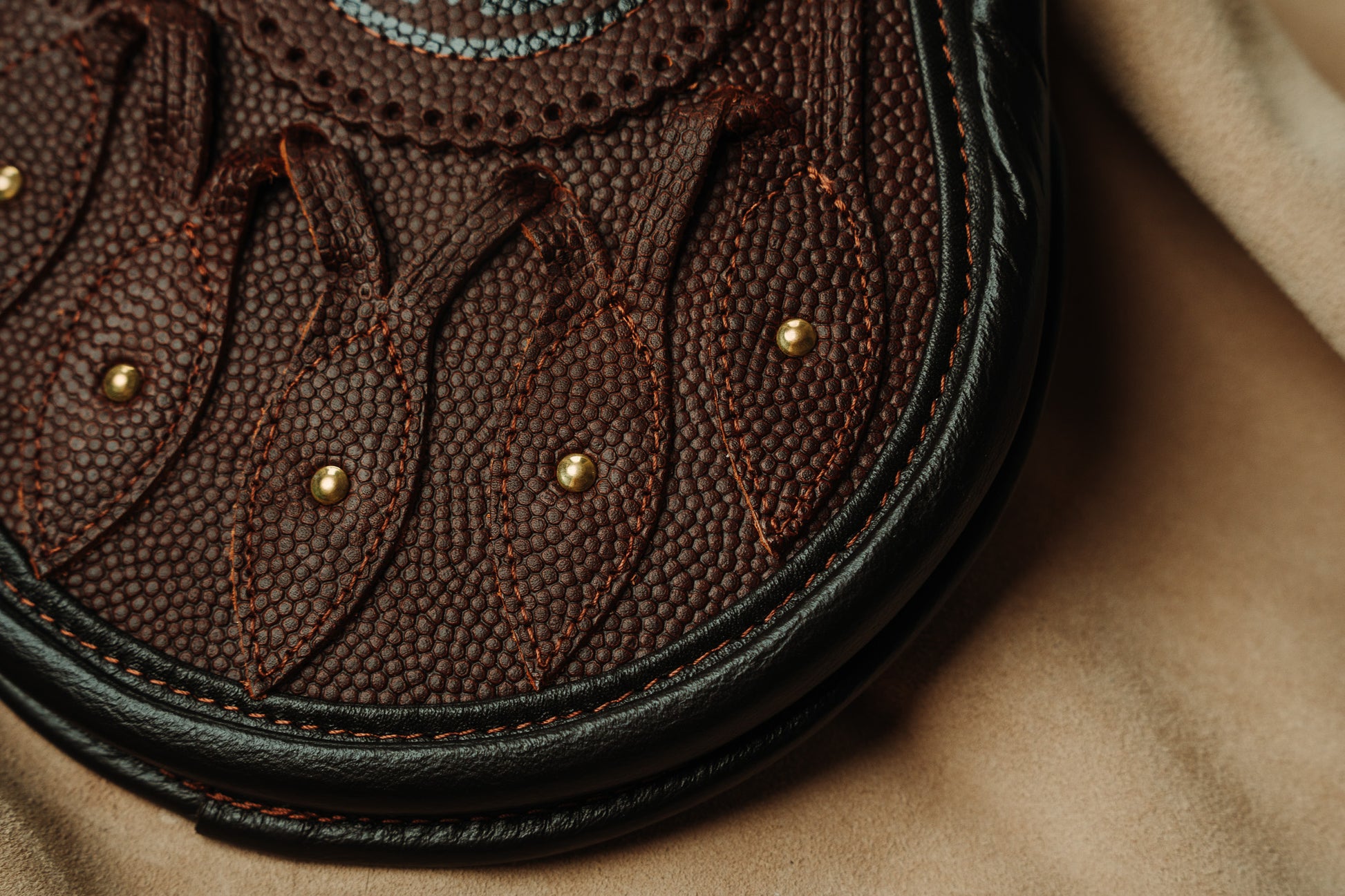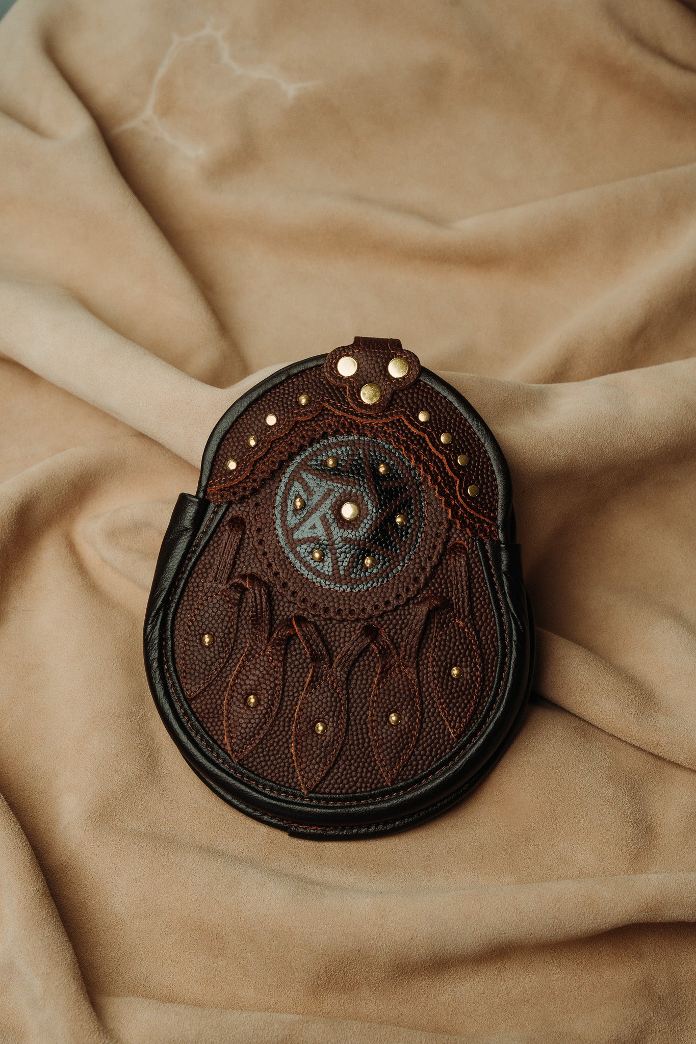 This all leather hunting sporran features brown pebbled leather for the body and petals. The leather binding is a darker brown to create a contrast. All the studwork is available in either silver or gold and the center targe has an embossed Celtic pattern with integrated silver or gold studwork.
