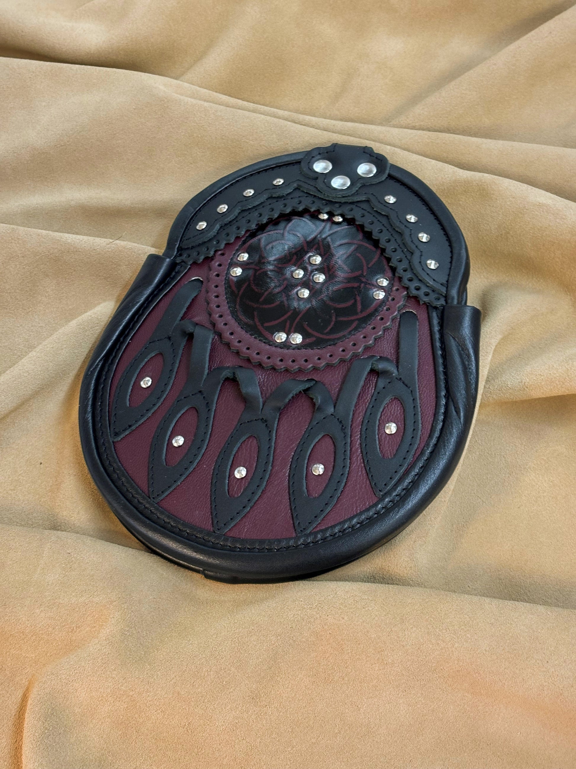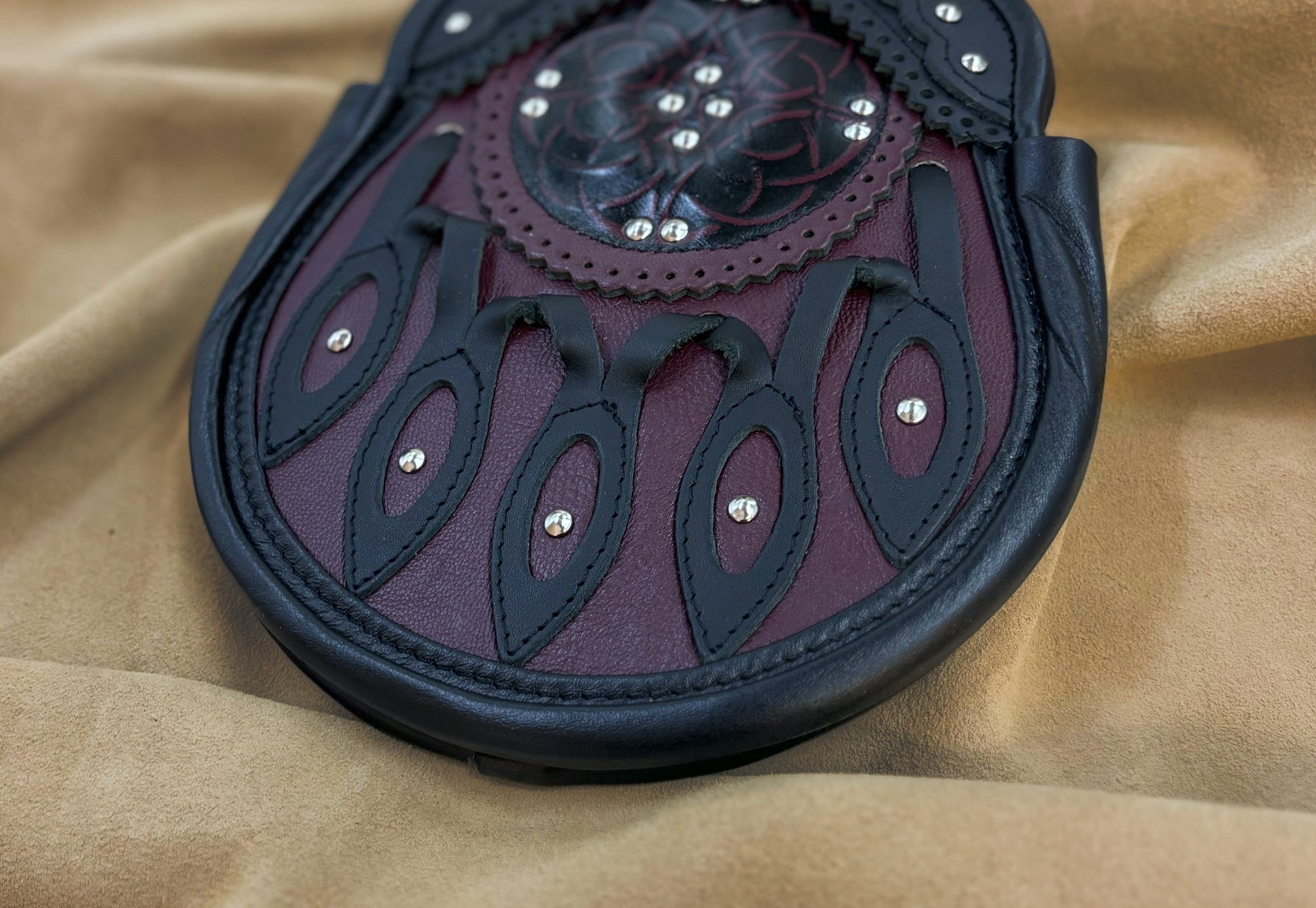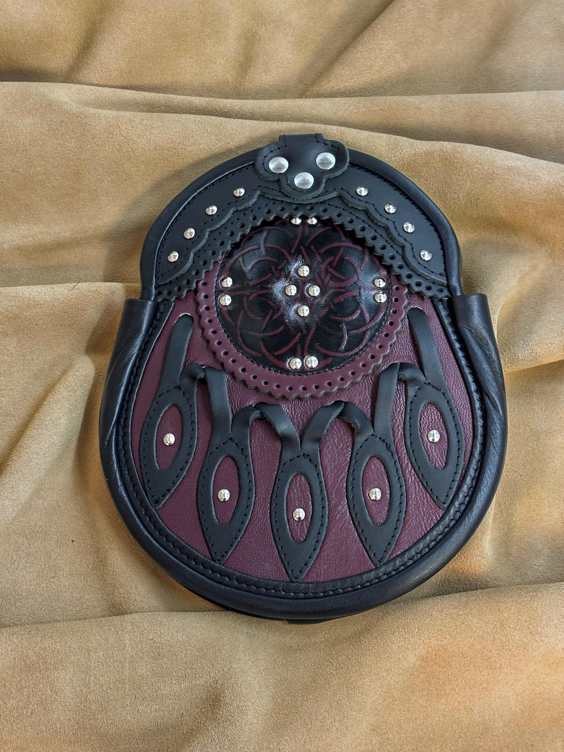 "Evan" is an all leather hunting sporran that utilizes 5 hollow petals to allow more colour to show through. The body of the sporran is made of burgundy kid leather for a very rich look. The burgundy targe features a Celtic eternity knot with integrated studwork. This sporran's unique colour will definitely make it a stand out.