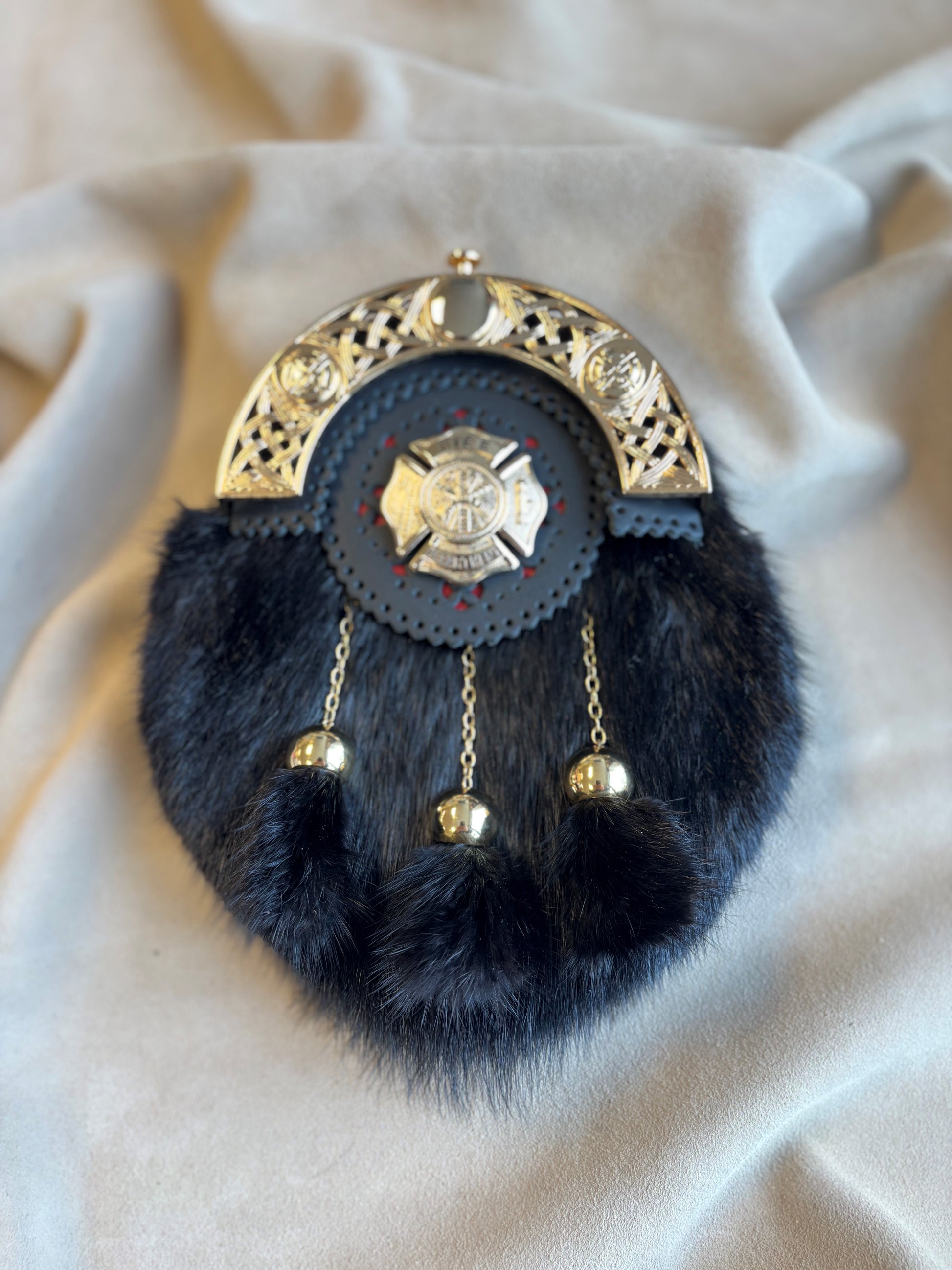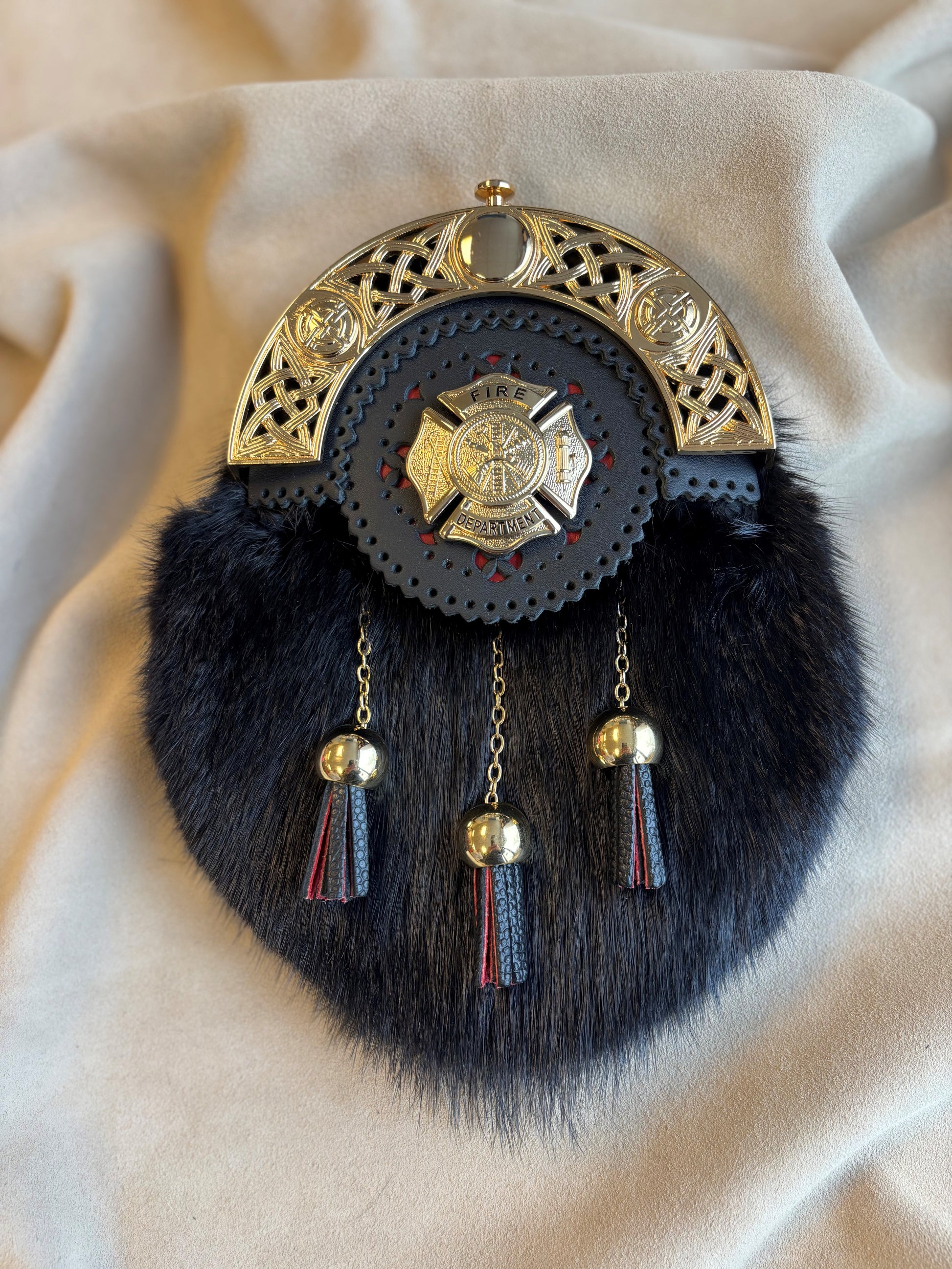 Our Full Dress Fire Fighter sporran utilizes black Muskrat fur with black fur tassels or black/red leather tassels on gold chains and ball bells. The sporran features a gold cantle with a black leather targe and a Fire Fighter badge surrounded by red accents.