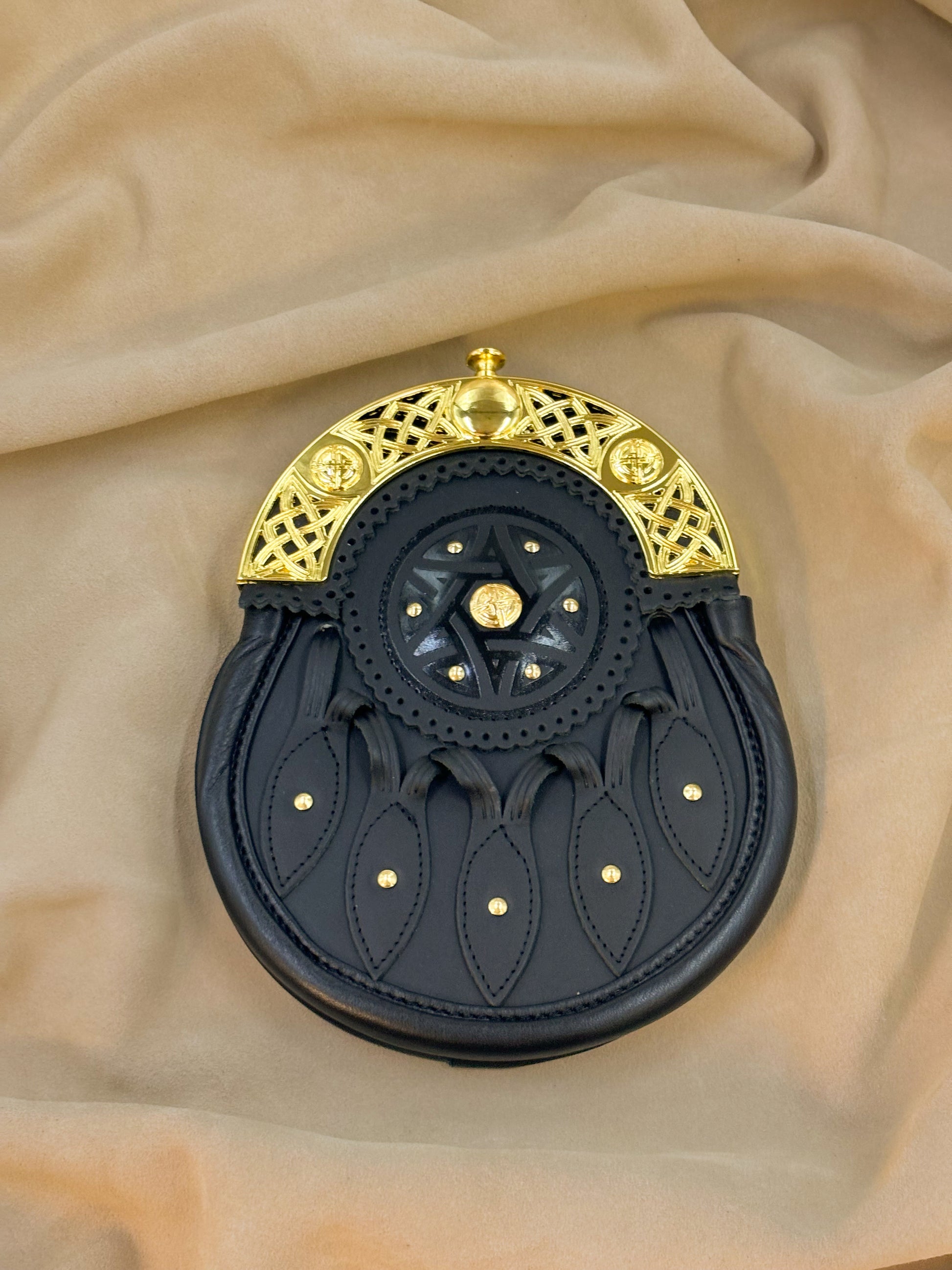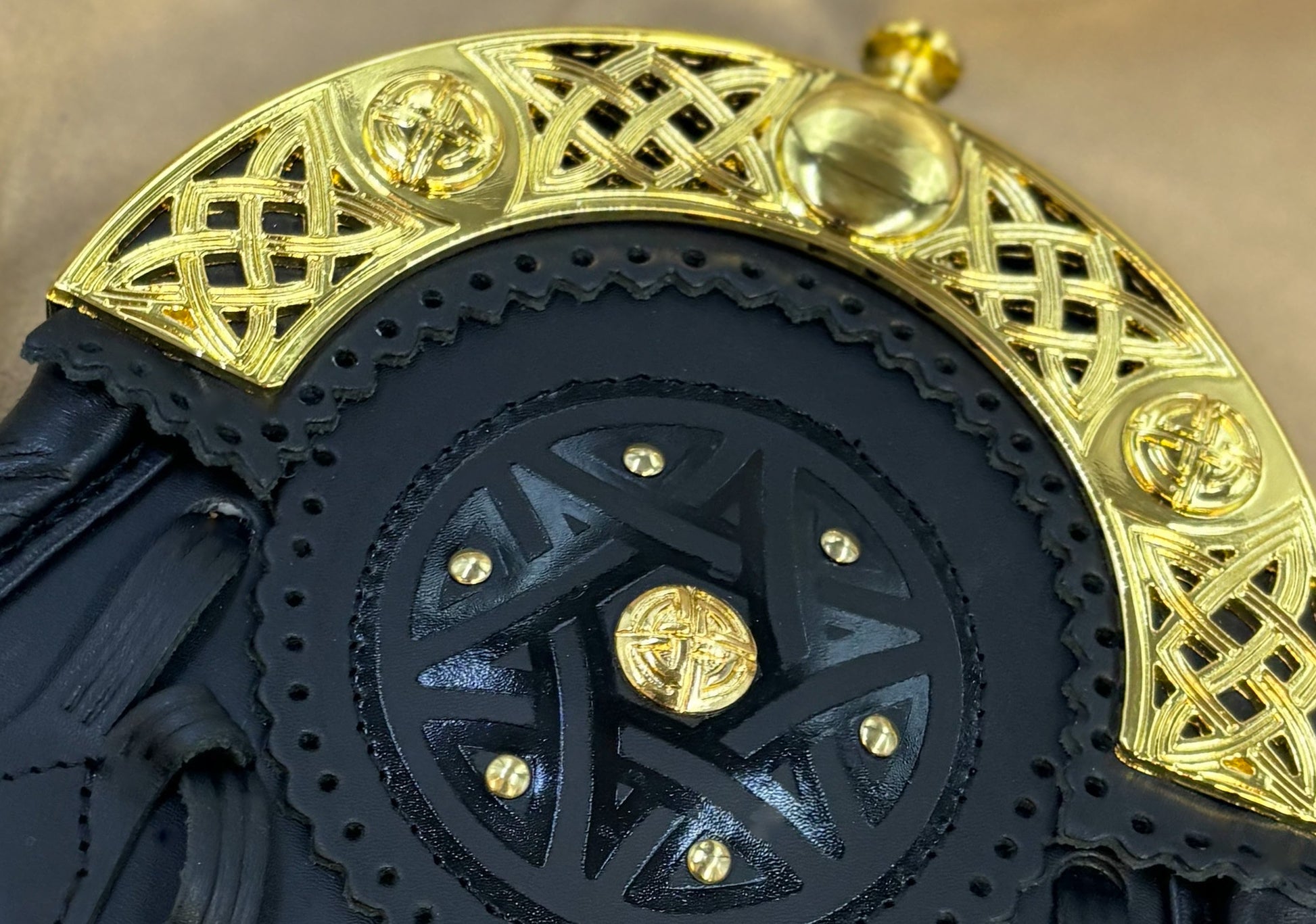This sporran is definitely a favorite of pipe bands everywhere, however that does not mean this very attractive sporran can't be worn by individuals. As a matter of fact it is well suited for day or evening wear with different levels of dress for many different occasions. This hunting sporran version features the standard 5 smooth leather petals, gilt studwork and gilt cantle with Celtic knotwork and a center targe with embossed Celtic artwork.