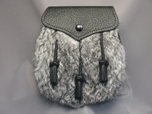 This sporran features a black pig grained leather flap and decorative stitching along the flap edge. The body utilizes grey chinchilla fur and 3 all leather tassels.