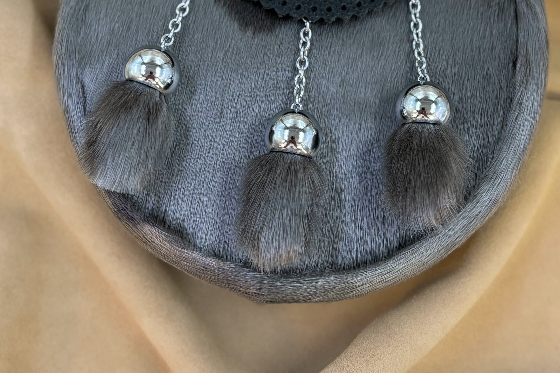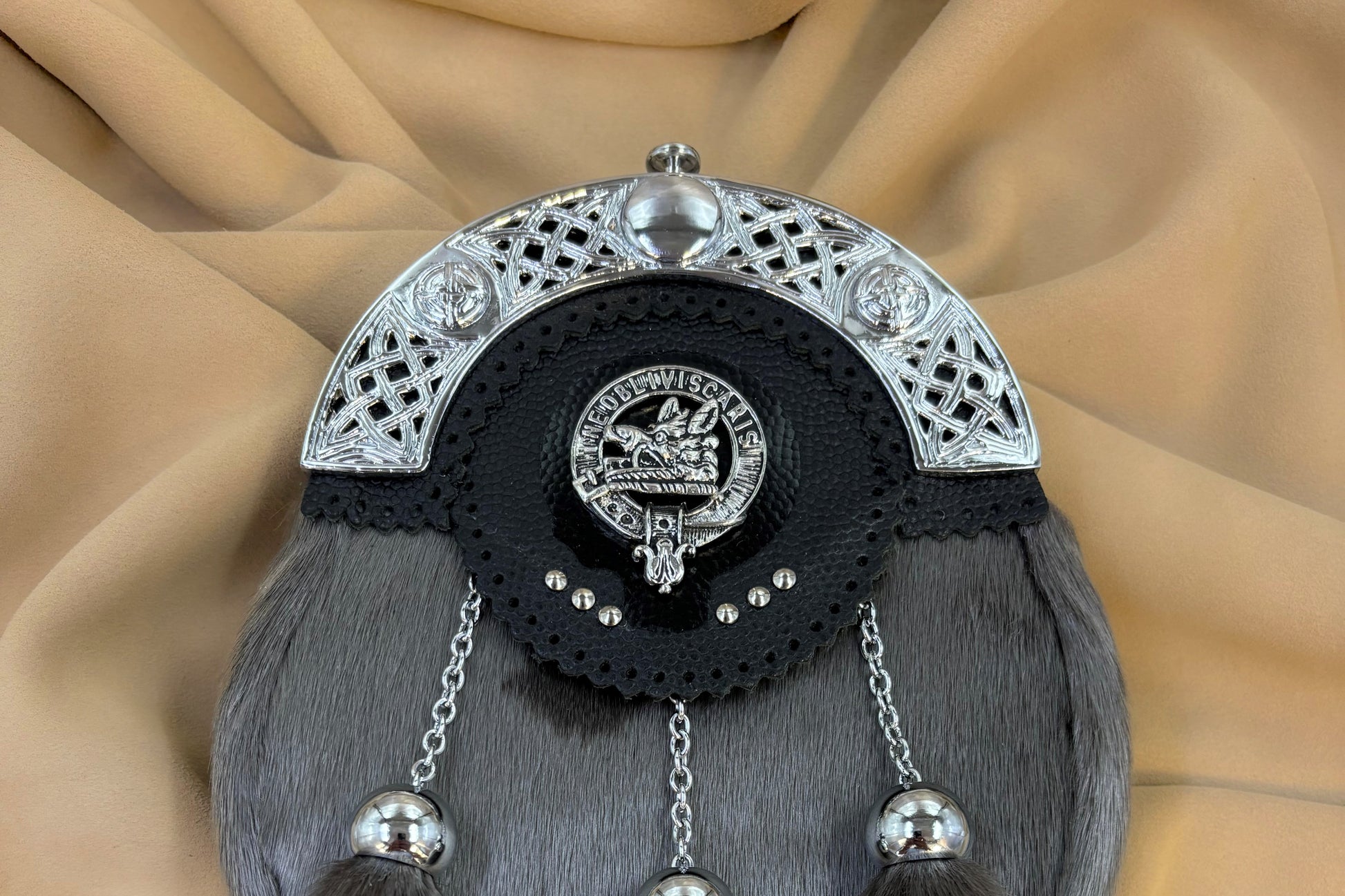 This sporran uses seal fur for the front body and the tassels. It features a Clan badge on a pebbled leather targe with surrounding chrome studwork and decorative stitching. The cantle is chrome and features a stamped Celtic weave pattern. The tassels are mounted on chrome chain and ball bells.