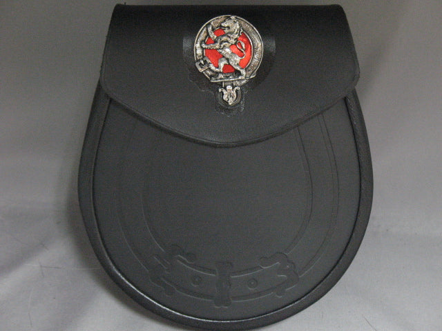 This sporran uses a high quality smooth black leather front and back. The flap features a mounted pewter clan crest badge of your choice with red background. The red creates a dramatic contrast between the badge and the background. The front has an embossed belt loop similiar to all Scottish clan crests.