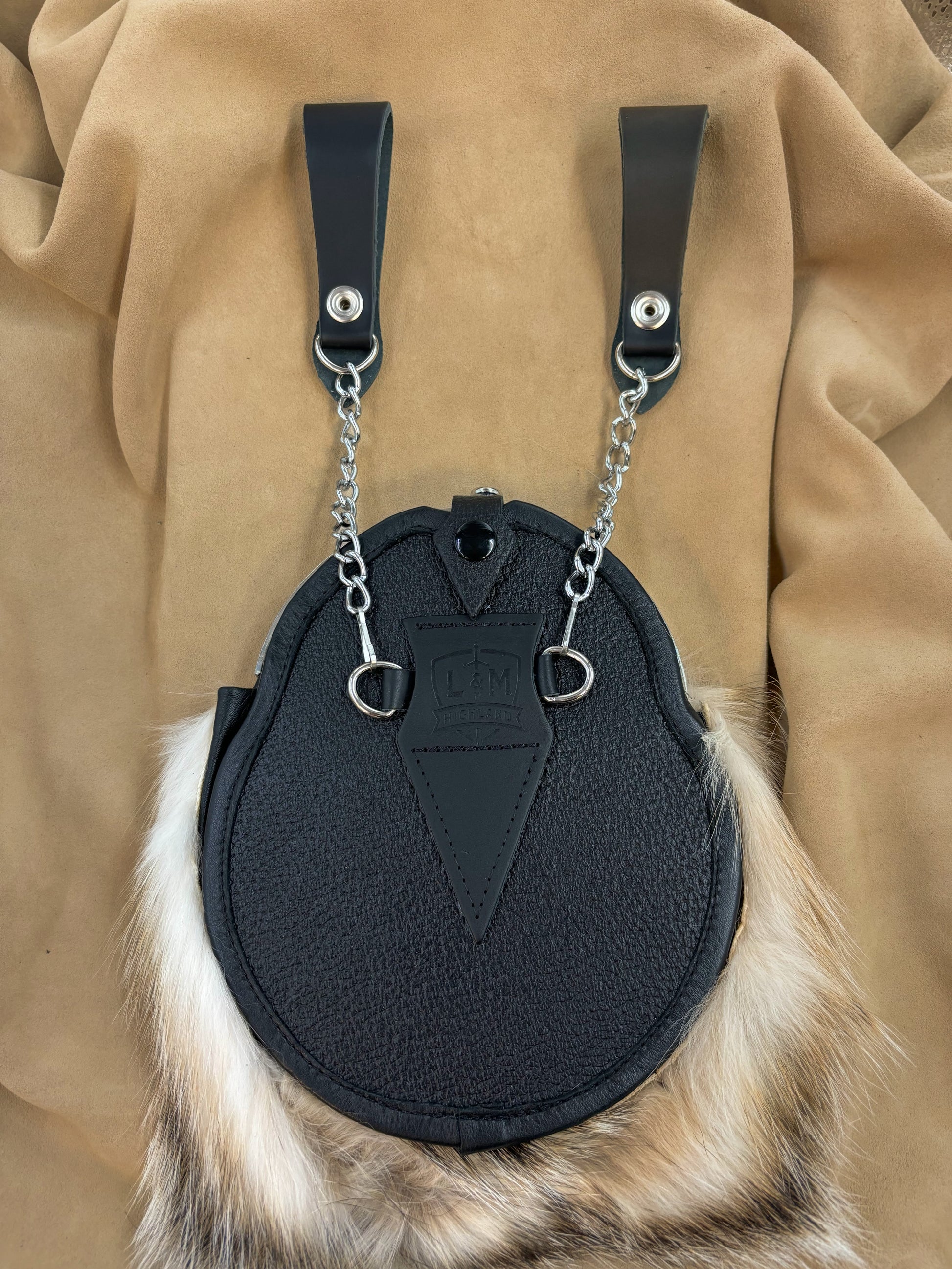 Sporran suspenders eliminate the need for a chain strap by allowing the sporran to hang directly from a waist belt. Available in black or brown leather.