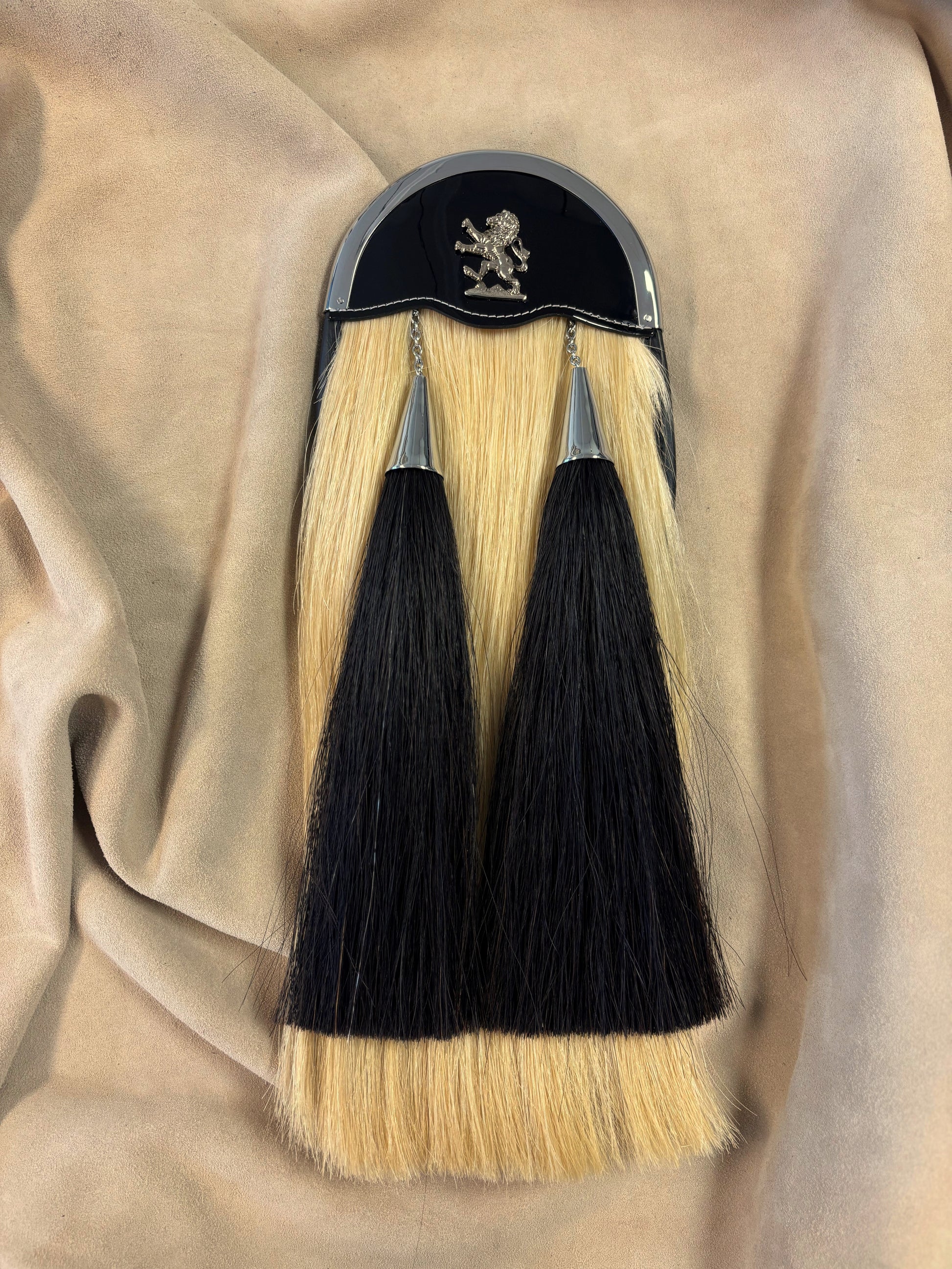 This is the horsehair sporran used by "Other Ranks" of the Essex & Kent Scottish. It features a white horsehair body and 2 black horsehair tassels on nickel chain and smooth nickel cones.