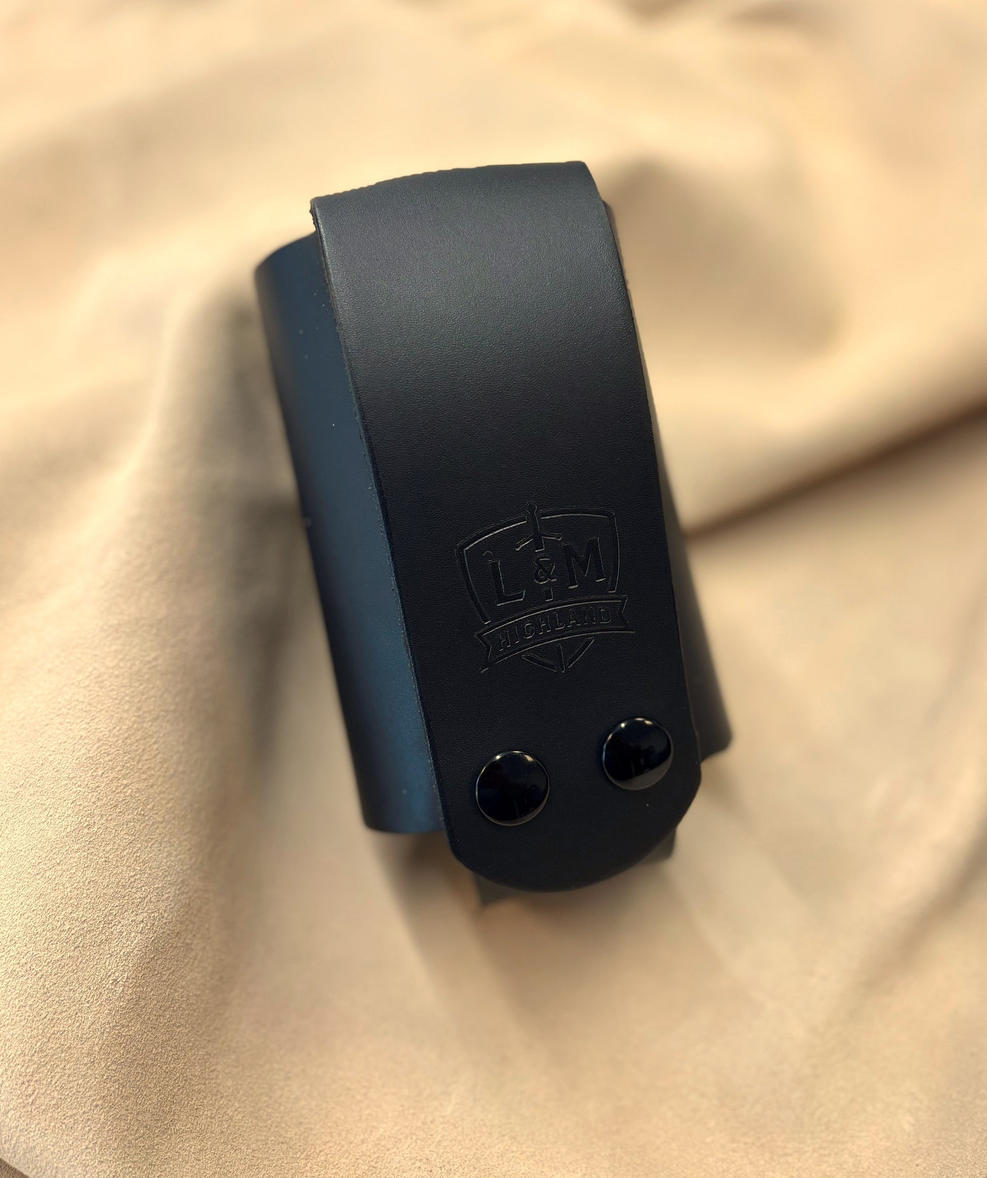 A heavy duty, high quality black leather bottle holder with an embossed Celtic Infinity pattern on the front. great for parades or anywhere you need ready access to fluids. Rear snap fasteners allow quick mounting or removal.