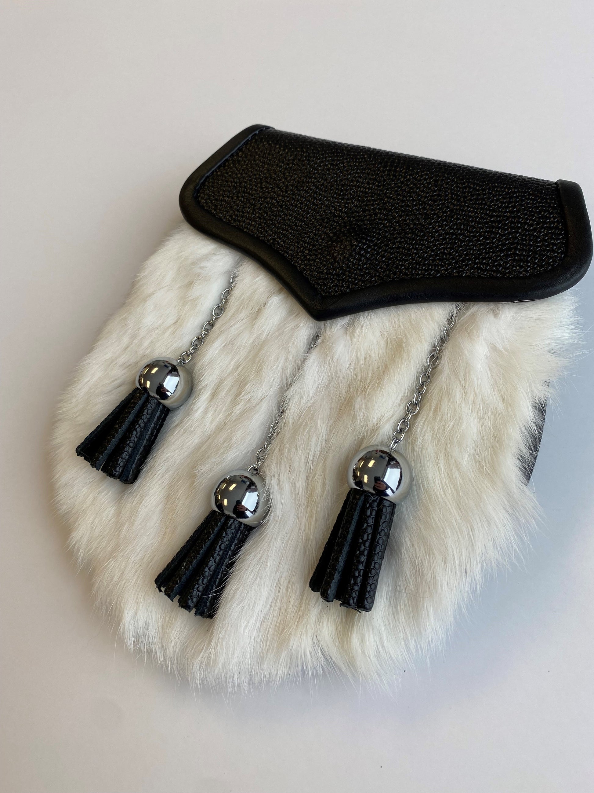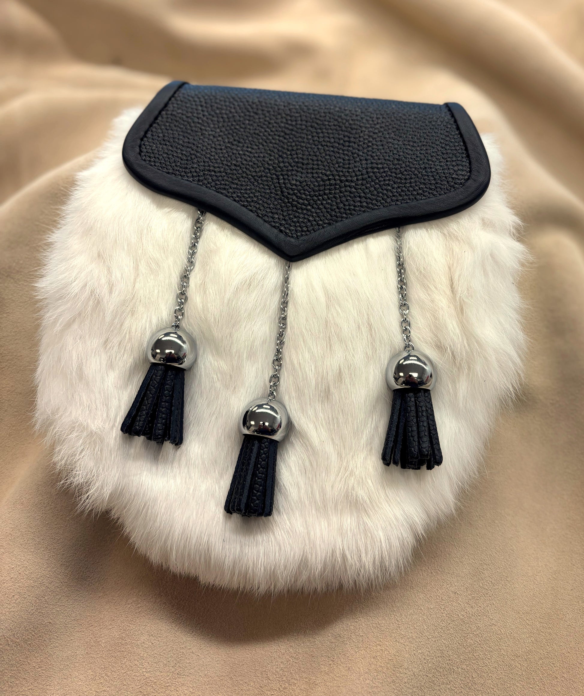 This sporran features a black pebbled leather flap and decorative edge binding. The body utilizes white rabbit fur and 3 leather tassels with chrome chain & ball bells.